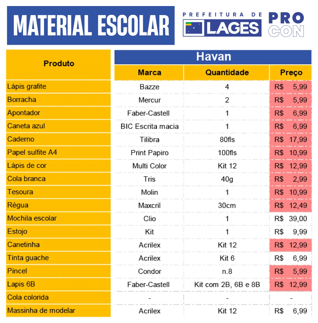 A pesquisa do Procon foi realizada no dia 6 de janeiro em sete estabelecimentos (Havan, MiMi, Casa Narciso, Papelaria Avenida, Milium, Mr. Clips e Lojão Astral). O levantamento incluiu itens essenciais como cadernos, lápis, estojos e mochilas, revelando disparidades de preços que reforçam a necessidade de comparação por parte do consumidor.