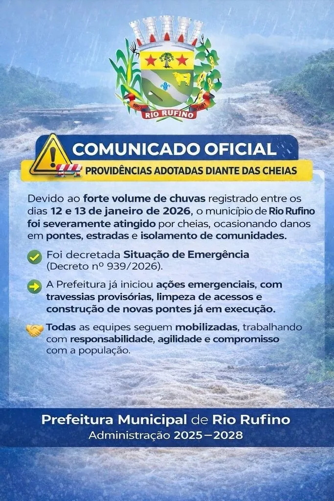 O governo municipal de Rio Rufino oficializou, nesta semana, o Decreto nº 939/2026, que estabelece Situação de Emergência em decorrência dos estragos causados pelas fortes chuvas que atingiram a região entre os dias 12 e 13 de janeiro. O temporal provocou a elevação repentina do nível de rios e córregos, resultando em danos severos à infraestrutura viária e no isolamento temporário de comunidades rurais.