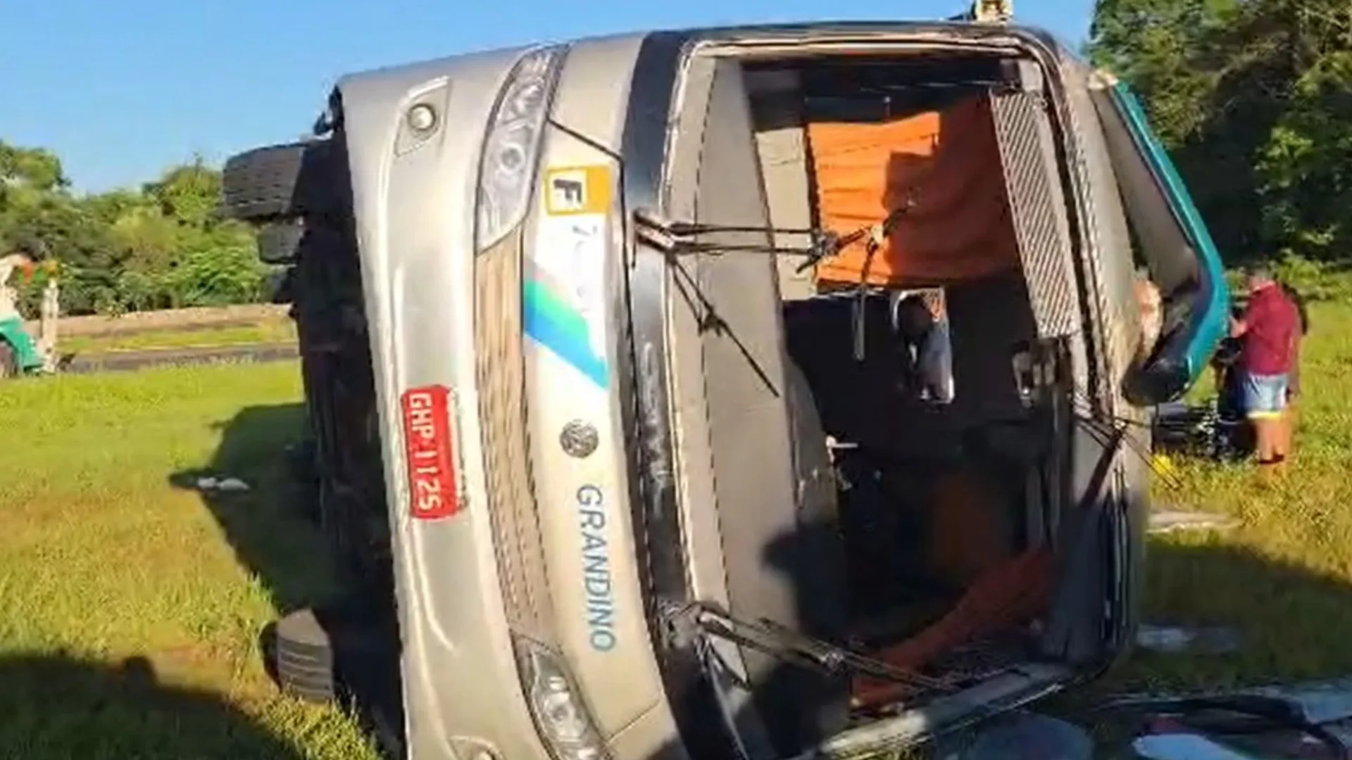 O ônibus seguia pela rodovia no sentido norte quando, no km 341, ao acessar a alça, o motorista perdeu o controle da direção e tombou, parando no canteiro central da rotatória.