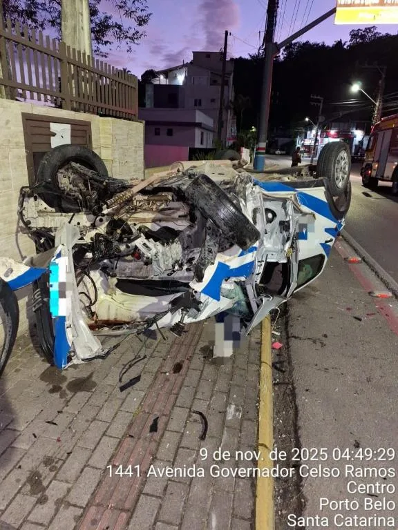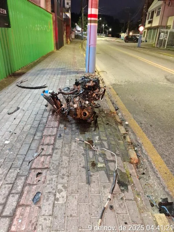 Um grave acidente de trânsito registrado na madrugada deste sábado (9) deixou um cenário de destruição na Avenida Governador Celso Ramos, em Porto Belo, no Litoral Norte de Santa Catarina. Por volta das 4h25, um carro de passeio colidiu violentamente contra um poste e capotou em seguida, resultando em perda total do veículo. O impacto foi tão forte que o motor se desprendeu do carro e foi arremessado até a calçada.