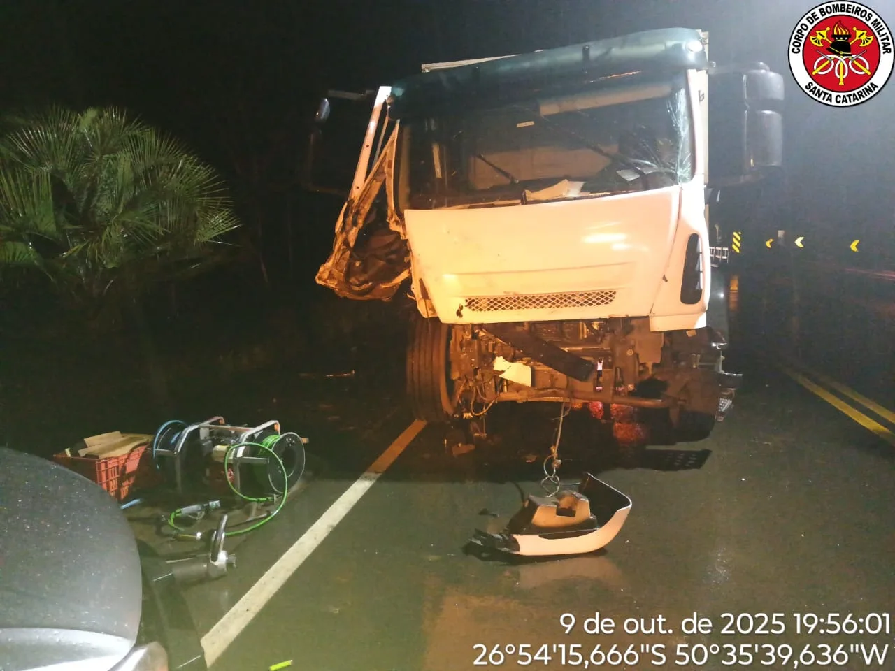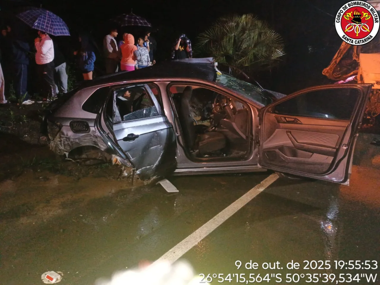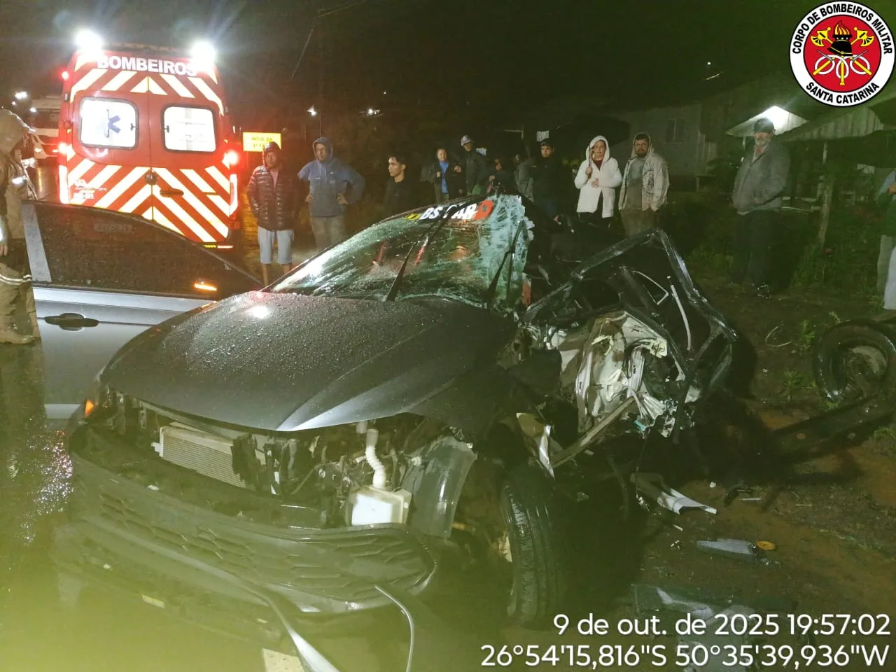O Corpo de Bombeiros Militar de Lebon Régis (CBMSC), foi acionado para atender à ocorrência. No local, as equipes constataram uma colisão transversal envolvendo um Volkswagen Polo e um caminhão Iveco Tector 310.