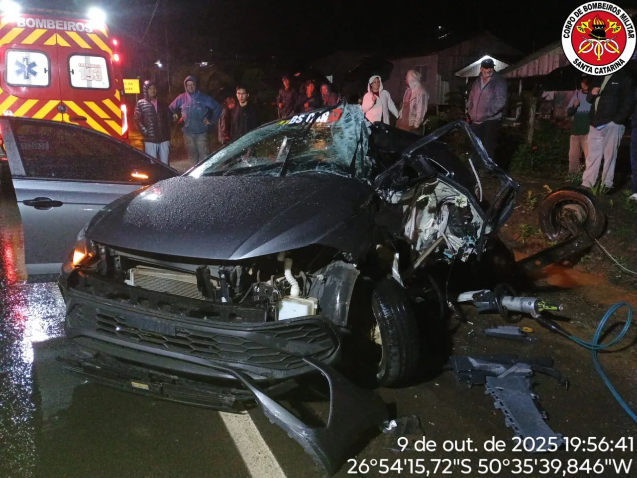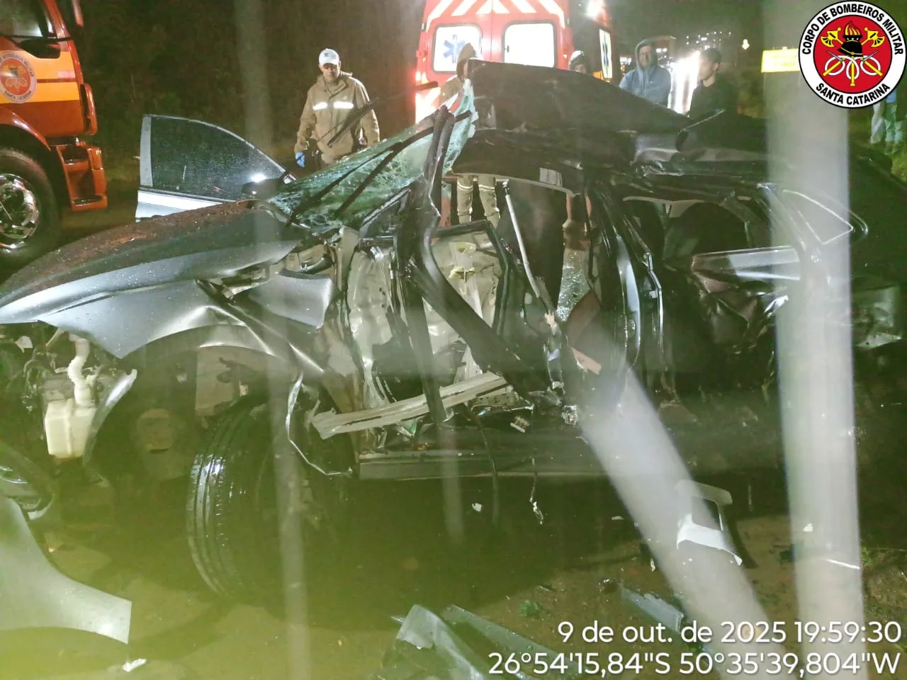 Carro fica irreconhecível após grave acidente de trânsito e deixa três vítimas presas às ferragens em SC