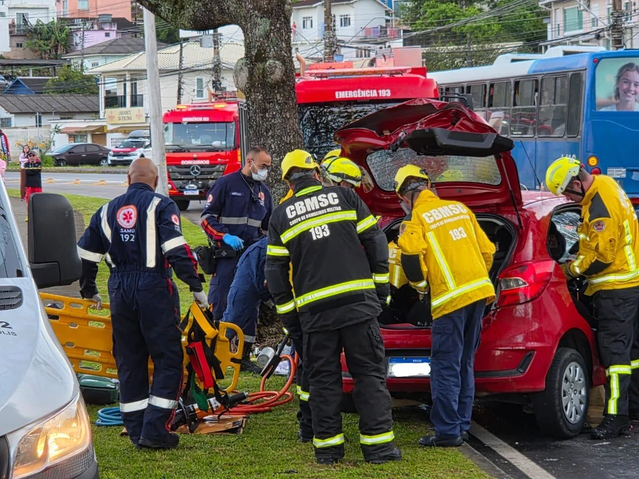 Segundo o Corpo de Bombeiros Militar de Santa Catarina (CBMSC), o ônibus bateu de frente com o veículo de passeio. No carro havia quatro pessoas, dois homens e duas mulheres.