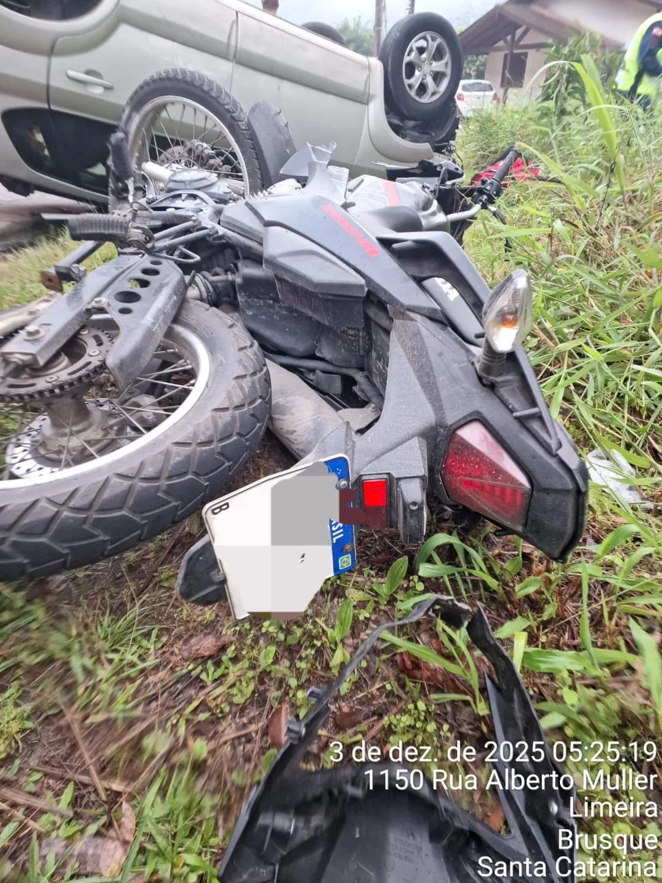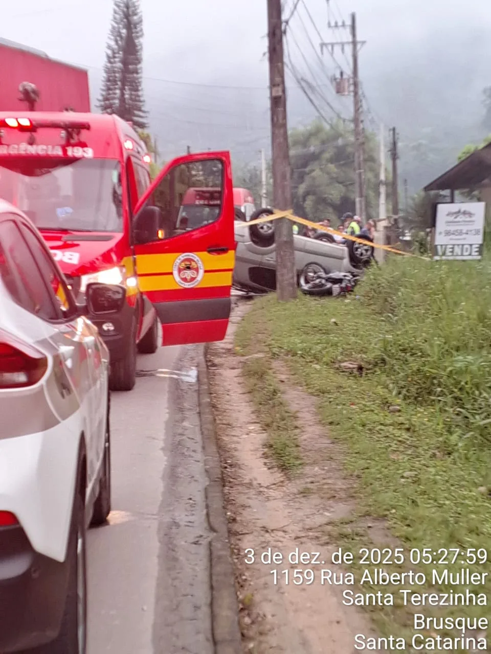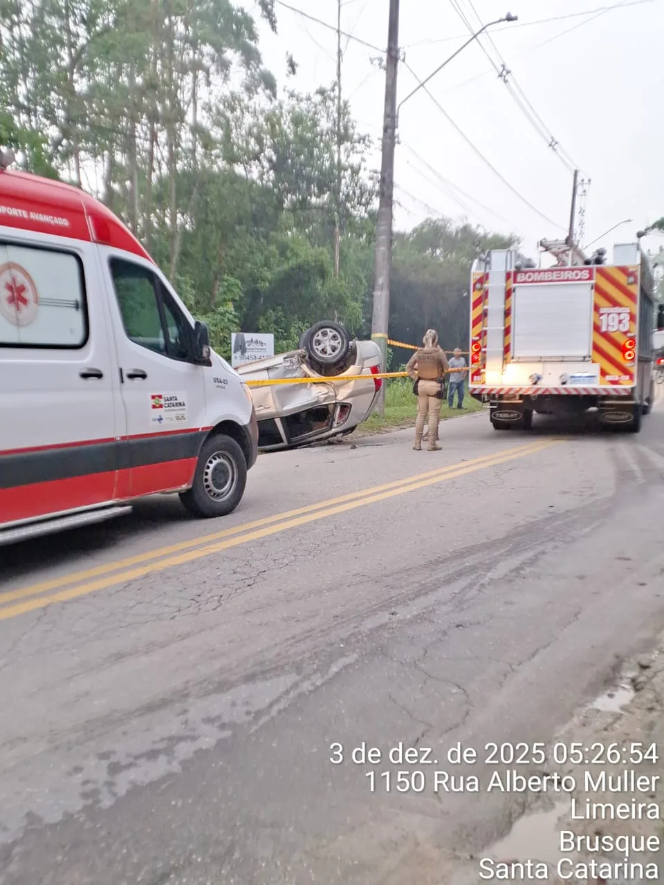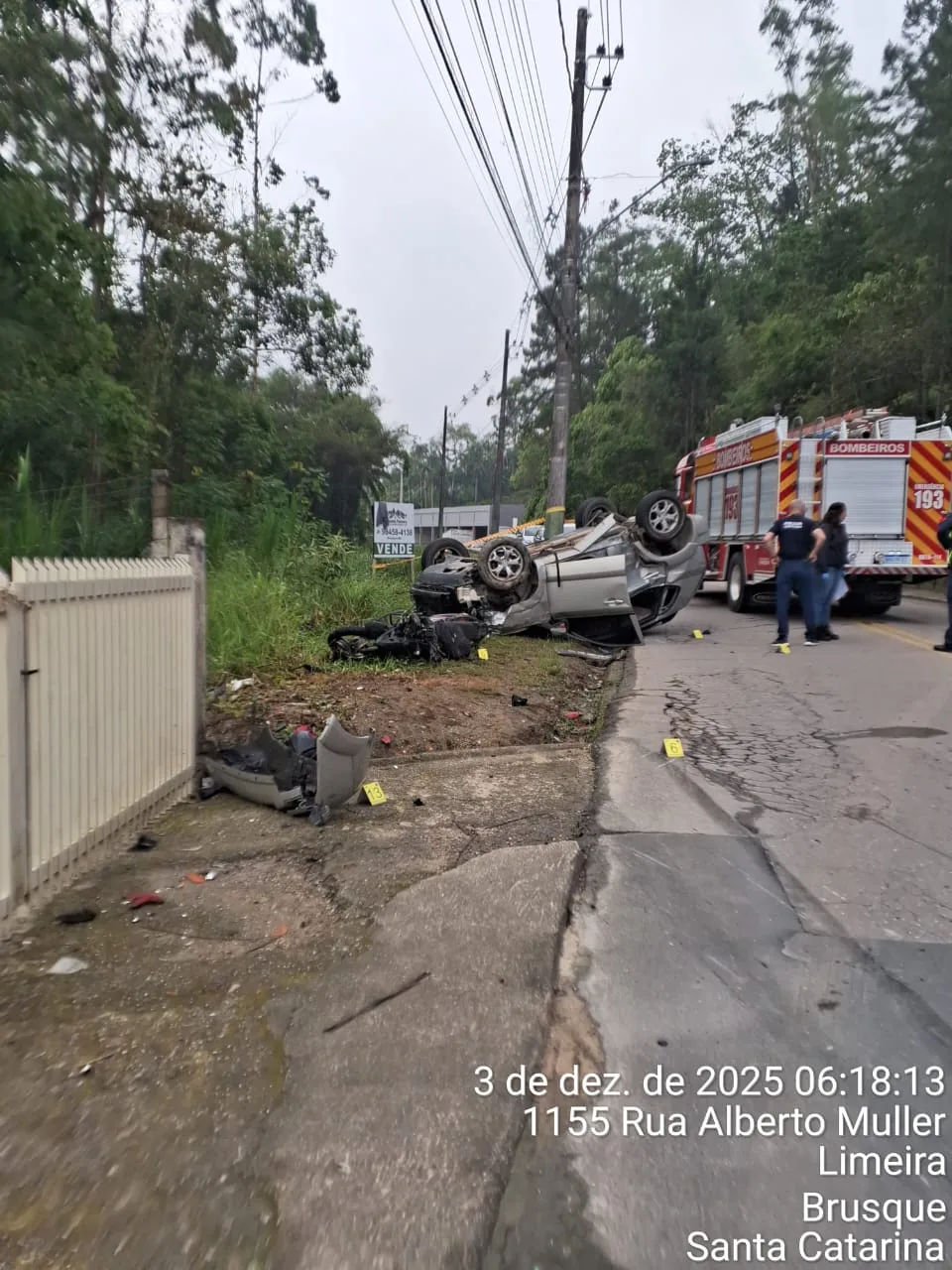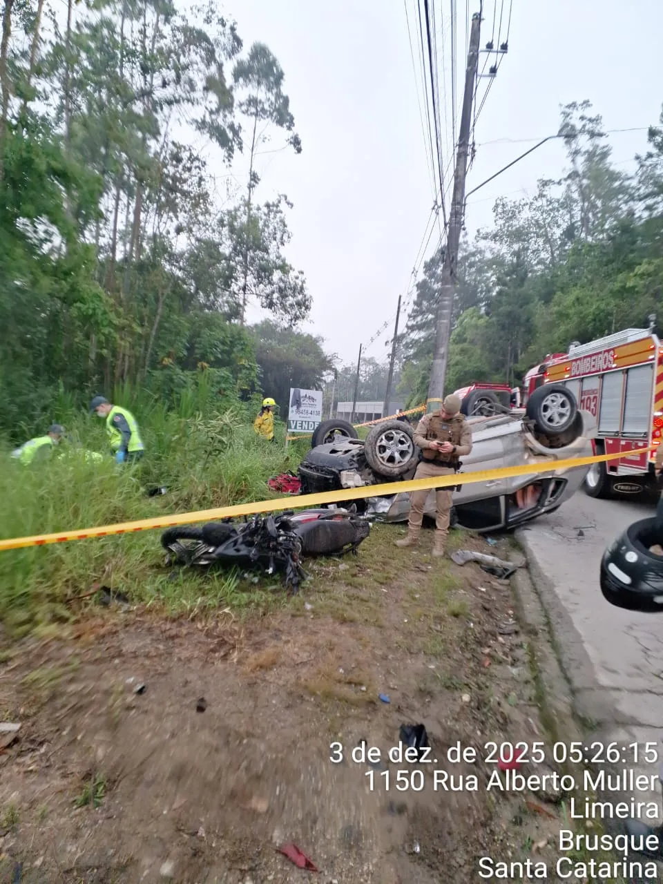 Um homem de 49 anos morreu em um grave acidente envolvendo um carro e duas motocicletas na madrugada desta quarta-feira (3), na Rua Alberto Müller, no bairro Limeira, em Brusque, no Vale do Itajaí. A colisão ocorreu por volta das 4h48 e fez com que o veículo capotasse na via.