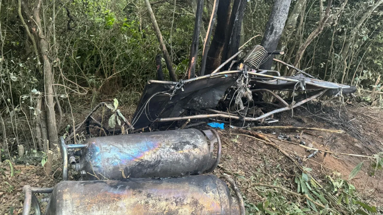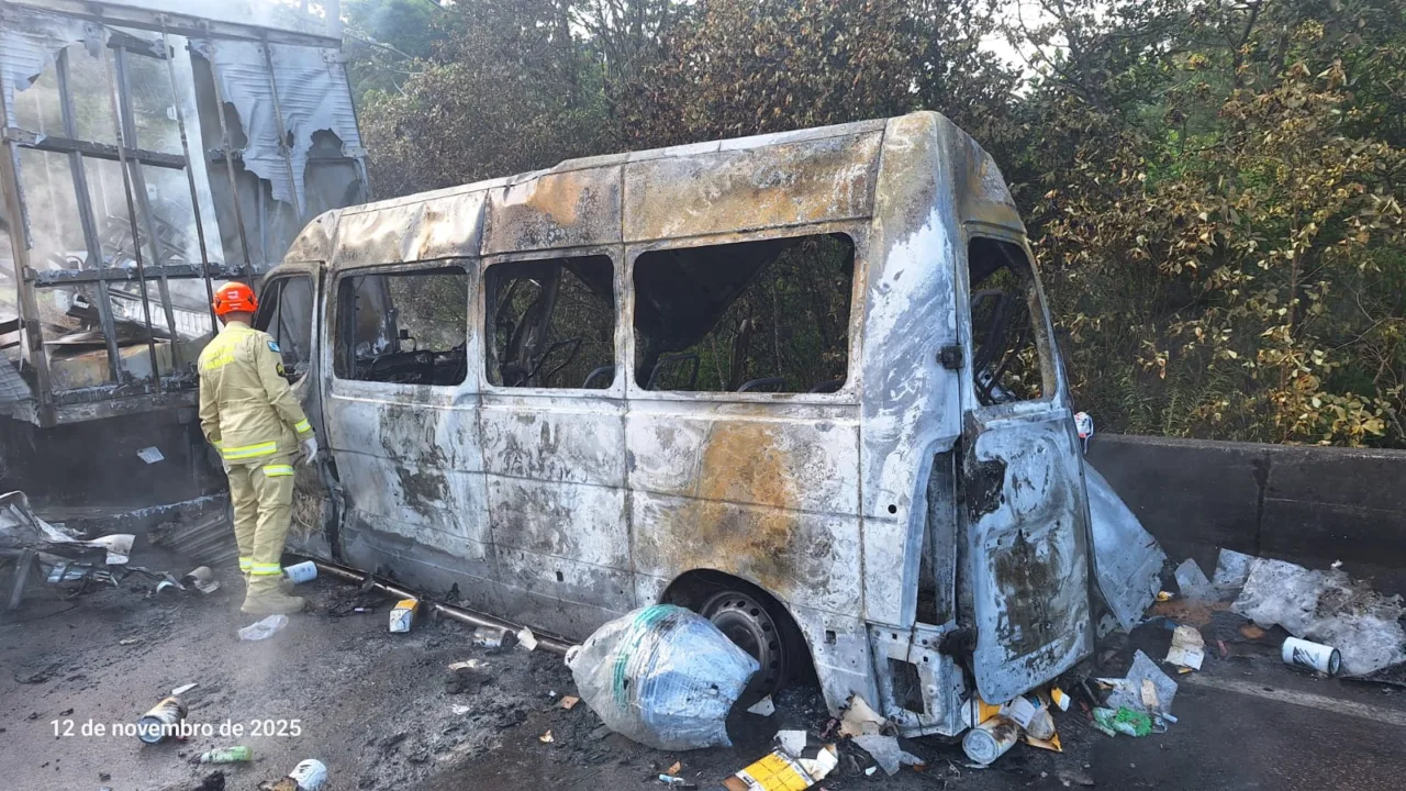 Com o impacto, a cabine do caminhão se desprendeu do chassi e ficou presa na traseira da carreta, enquanto o baú foi lançado para a faixa da direita. Em seguida, a van e o caminhão pegaram fogo.