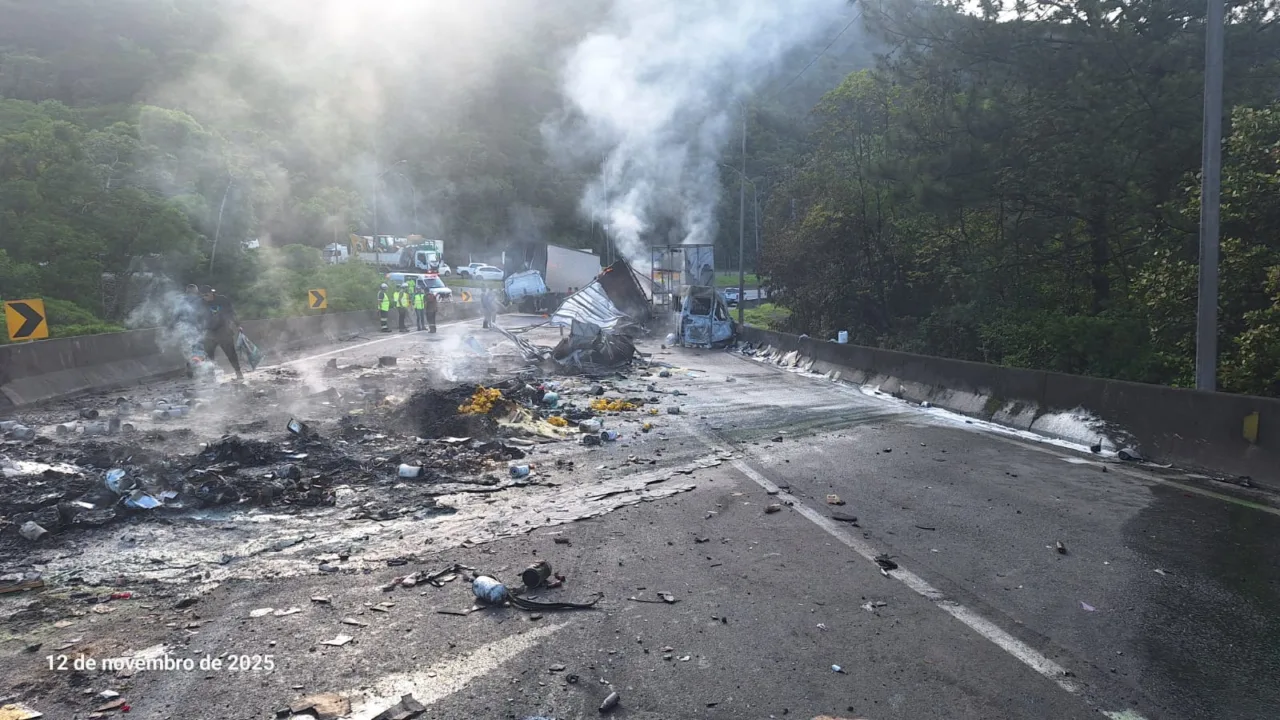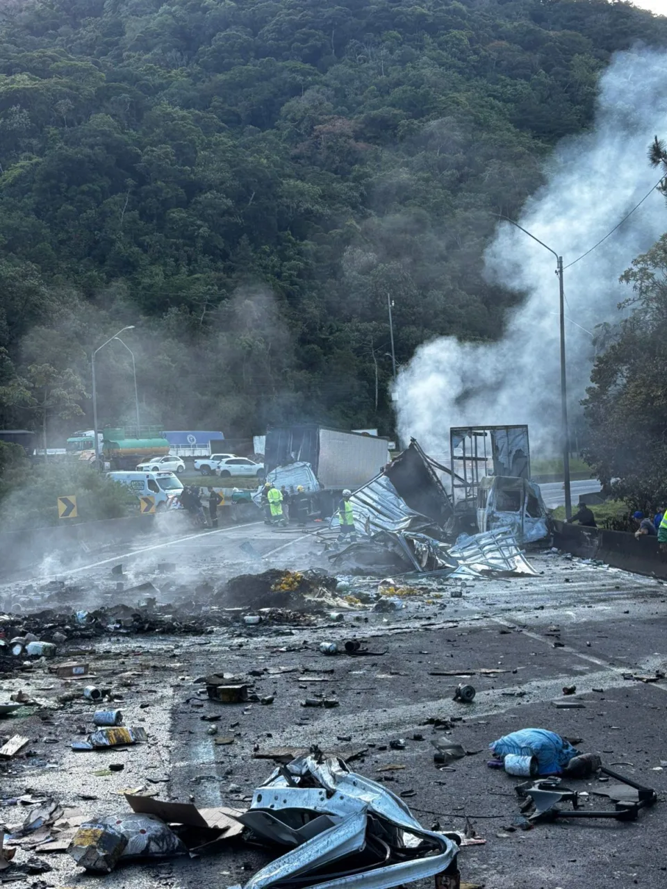 Veículos pegaram fogo após o acidente registrado na BR-376, em Guaratuba, que deixou um morto e feridos