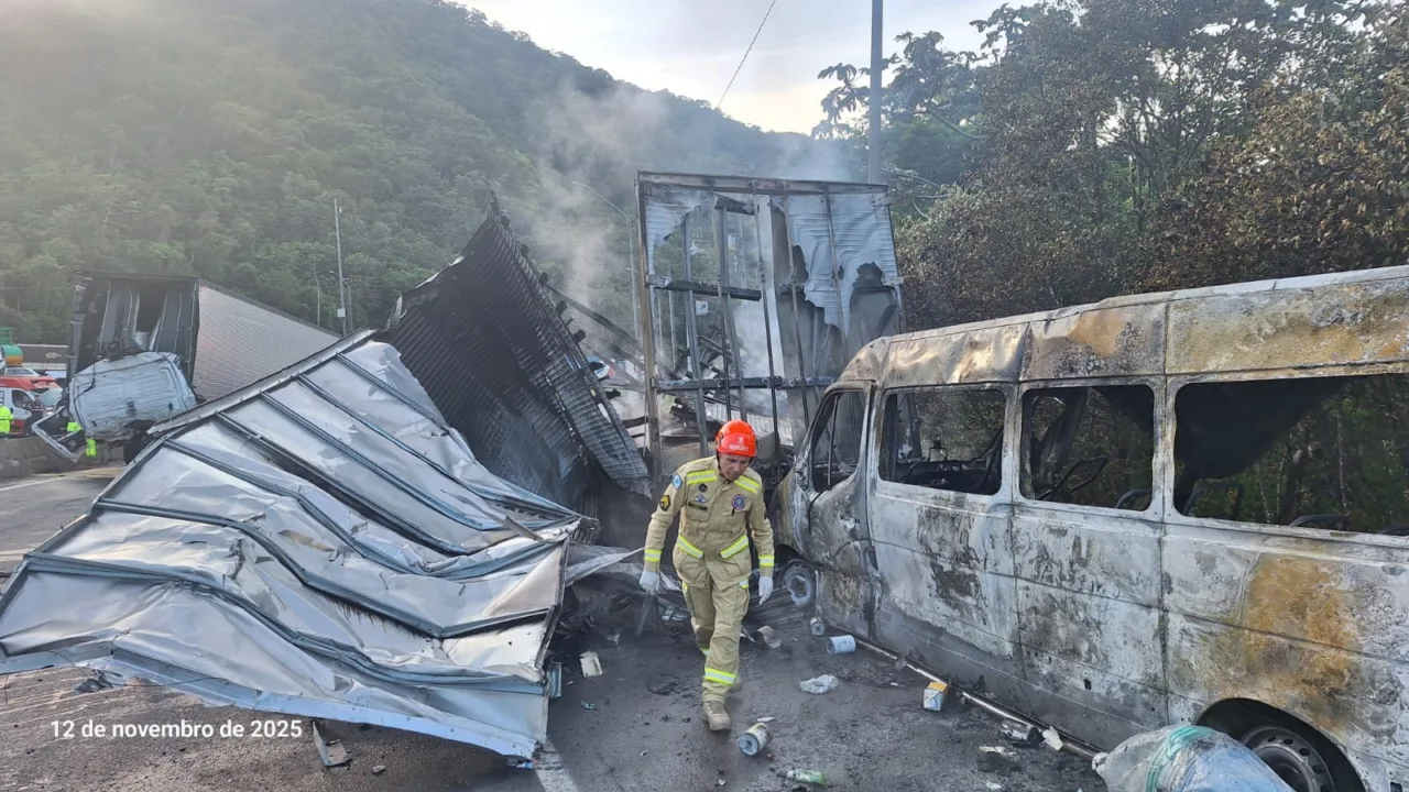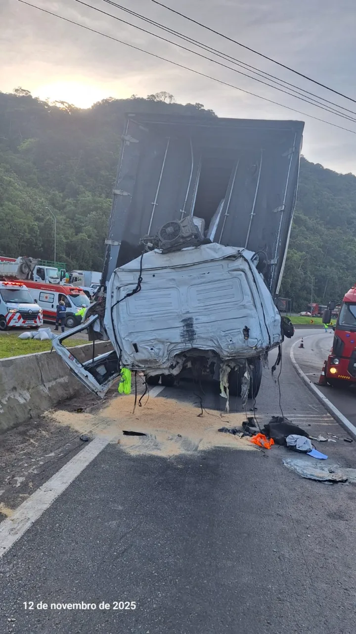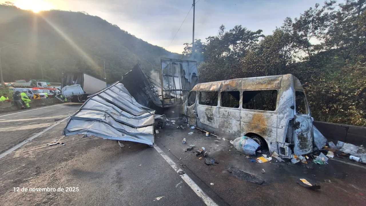Após percorrer parte do trecho fechado, o caminhoneiro retornou para a faixa liberada e acabou colidindo com uma van, que foi arremessada contra a mureta de proteção. Na sequência, o caminhão atingiu uma carreta que seguia à frente.