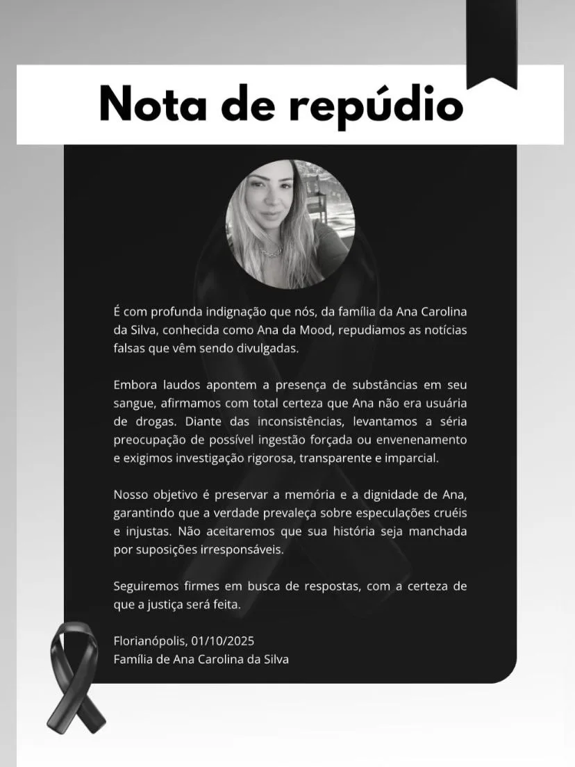 A família de Ana divulgou uma nota de repúdio, na qual se posiciona publicamente contra as notícias que vinculam a empresária ao uso de drogas. Confira: