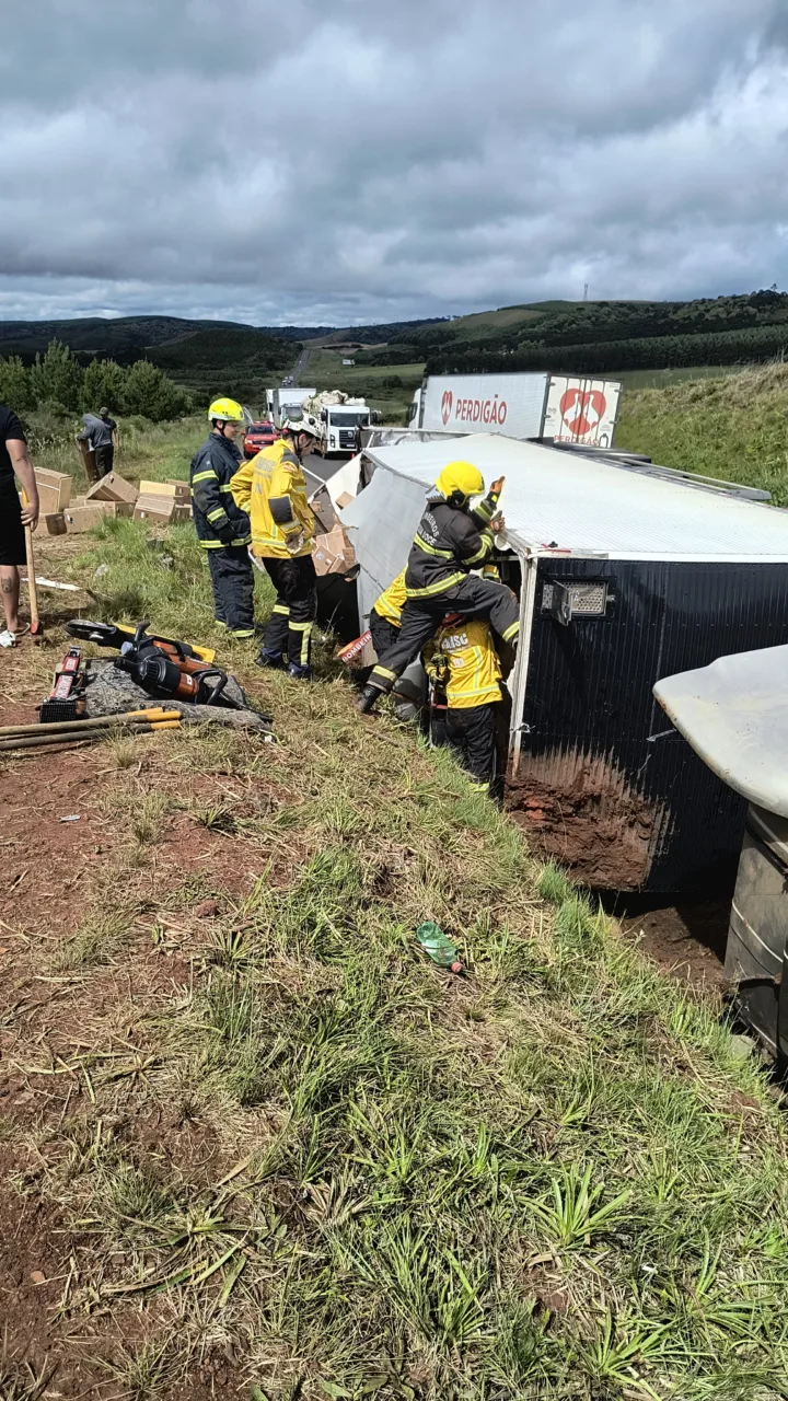 Motorista morre preso às ferragens após caminhão tombar na BR-153 em SC; carga é saqueada