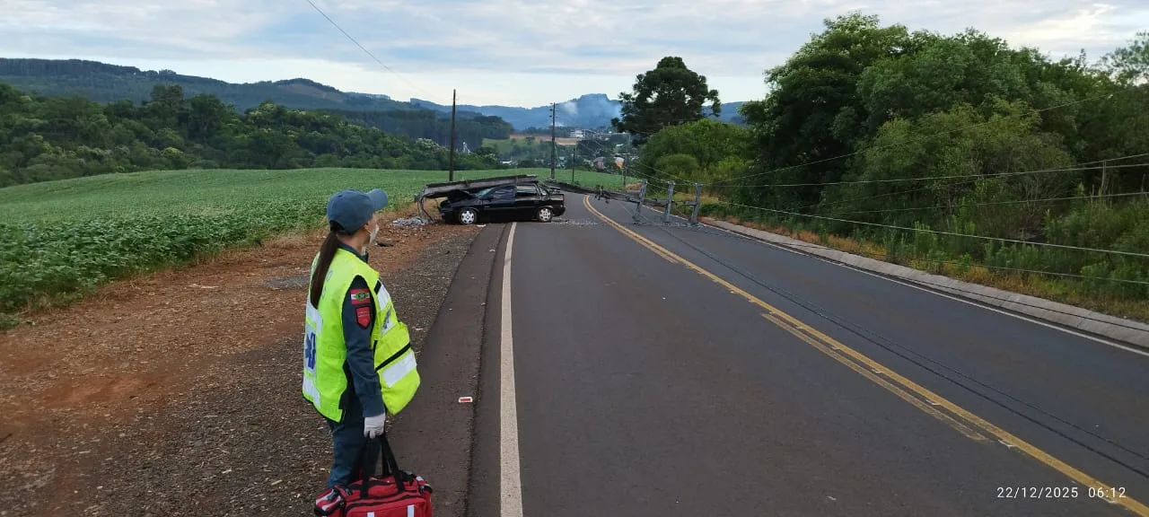 Um acidente de trânsito registrado no início da manhã desta segunda-feira (22) chamou a atenção em Barra Grande, no Oeste de Santa Catarina, após um veículo sair da pista e colidir contra um poste de energia elétrica, que acabou caindo sobre o próprio carro e interditando a via.