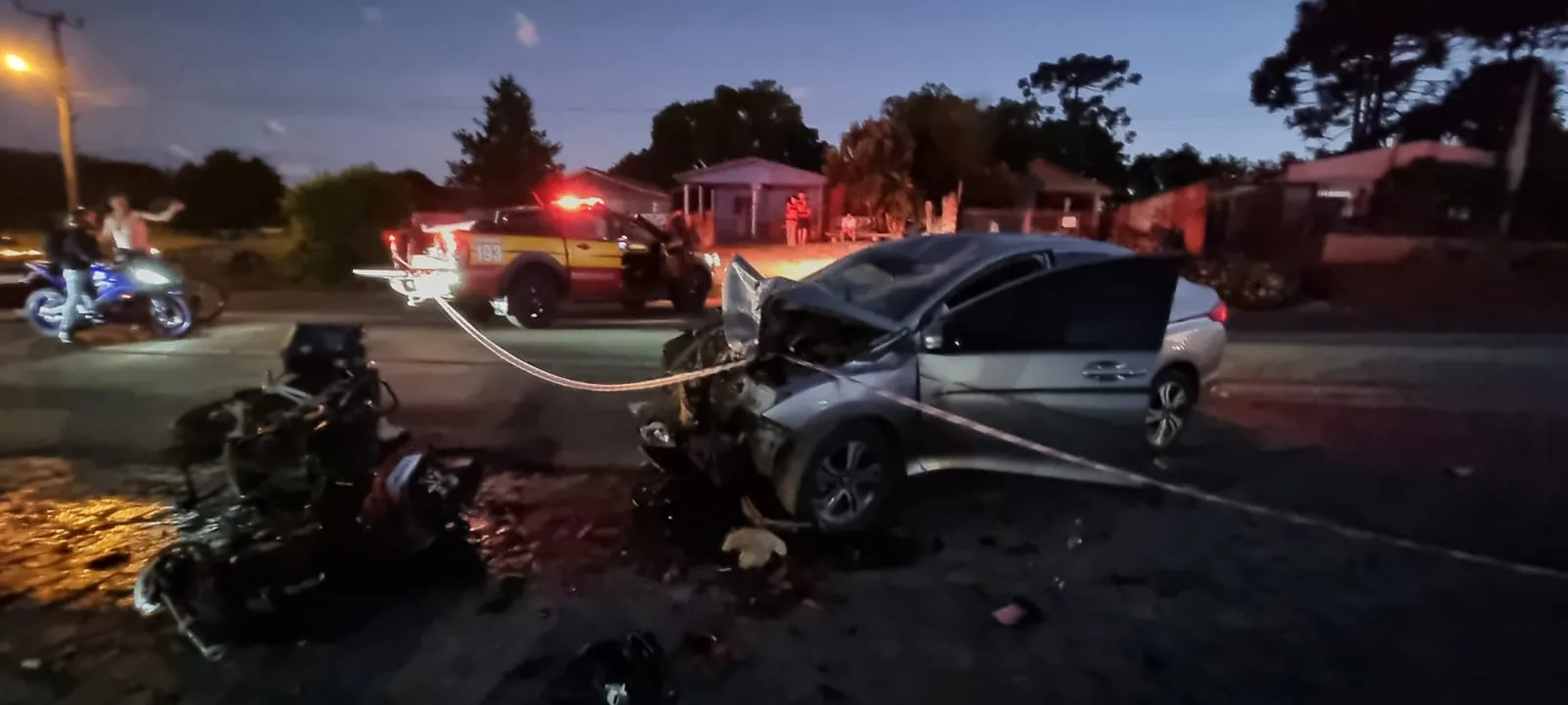 Já as duas vítimas da motocicleta Triumph Tiger 900 estavam caídas na via. Regersson já estava sem sinais vitais quando a equipe chegou. A passageira, Tamara Zimmermann de Souza, foi encontrada em estado grave.