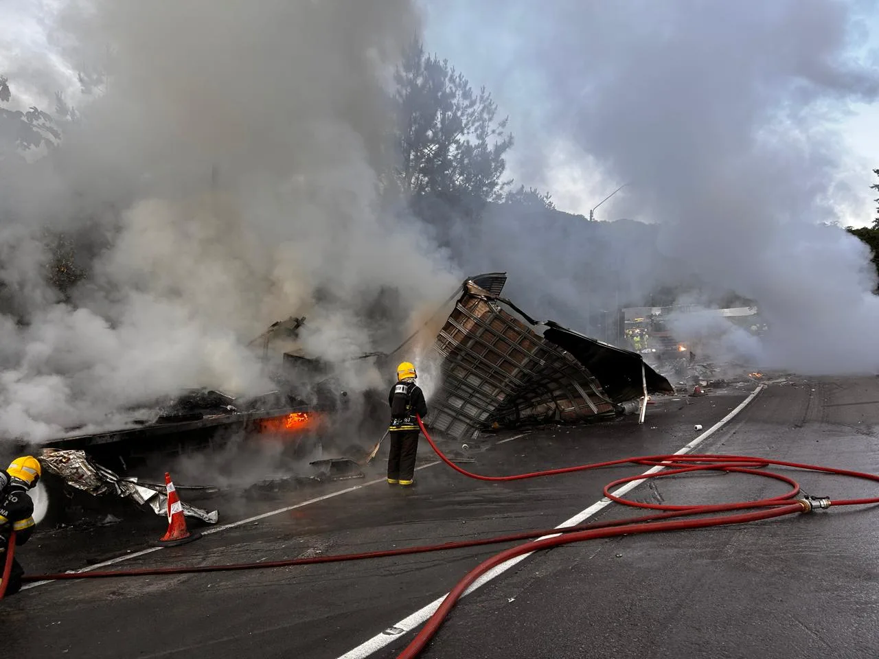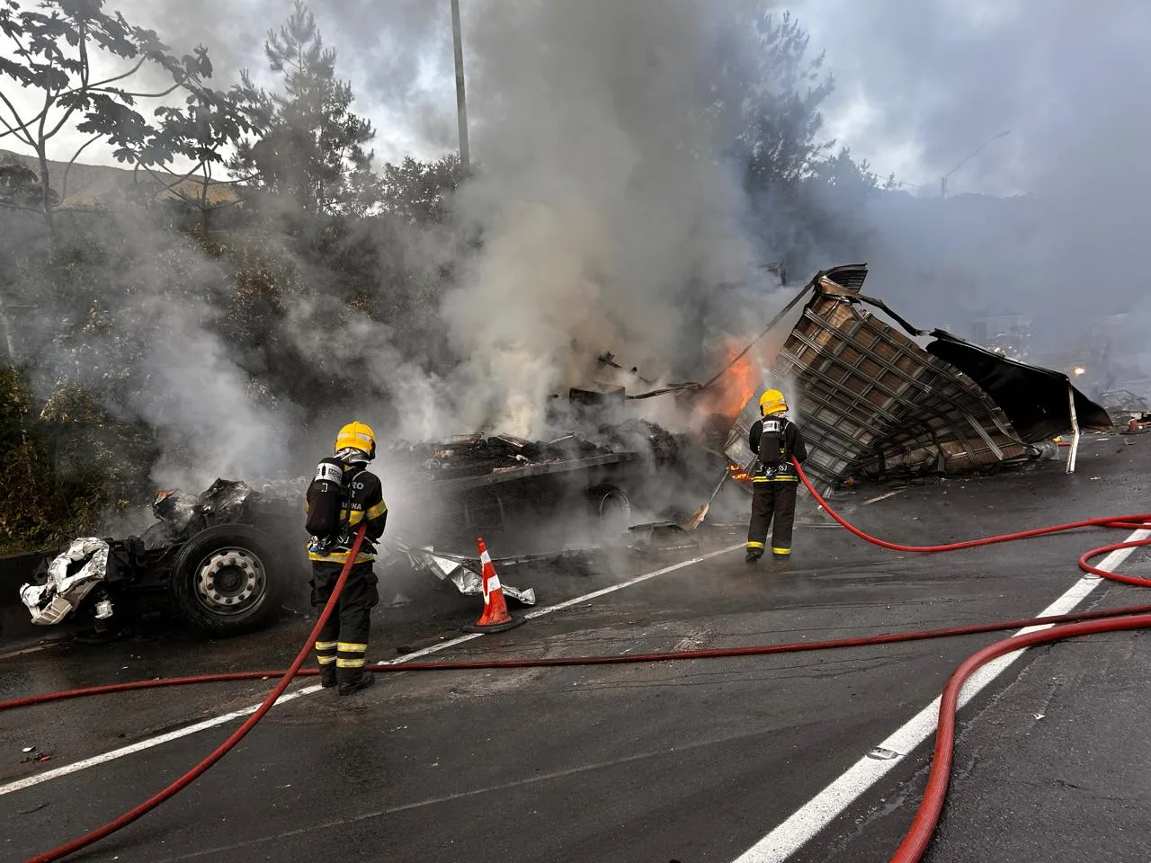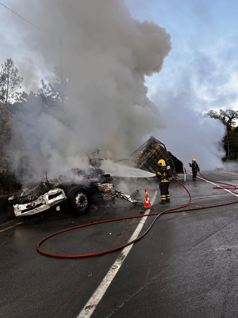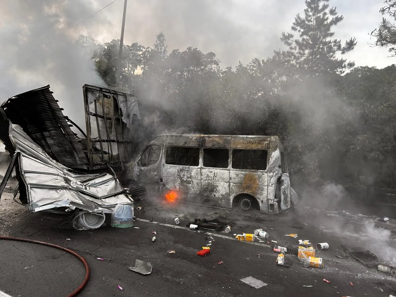 Ainda segundo a PRF, a van e o caminhão pegaram fogo após as colisões. Mesmo ferido, o motorista da van usou uma faca para cortar os cintos de segurança e conseguiu retirar os 15 passageiros antes que o veículo fosse totalmente consumido pelas chamas.