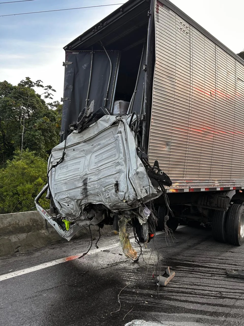 Com o impacto da batida, a cabine se desprendeu da estrutura do veículo e ficou presa na traseira da carreta, enquanto o baú foi arremessado para a faixa direita.