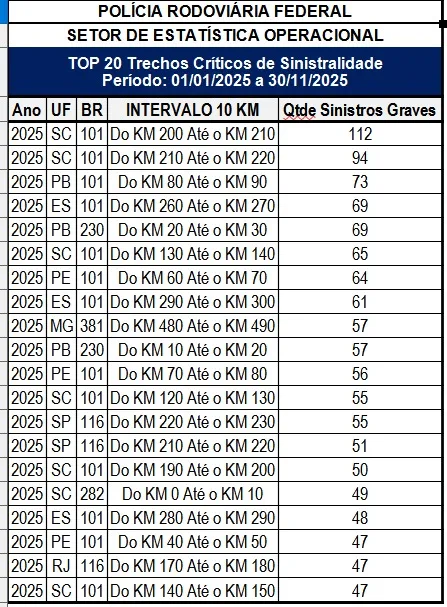 Santa Catarina concentra alguns dos pontos mais perigosos das rodovias federais brasileiras. Um levantamento recente da Polícia Rodoviária Federal (PRF) mostra que o trecho da BR-101 entre os quilômetros 200 e 210, em São José, na Grande Florianópolis, é atualmente o mais crítico do país em número de sinistros graves. No intervalo analisado, entre 1º de janeiro e 30 de novembro de 2025, foram registradas 112 ocorrências, número superior ao de qualquer outro segmento federal no Brasil.