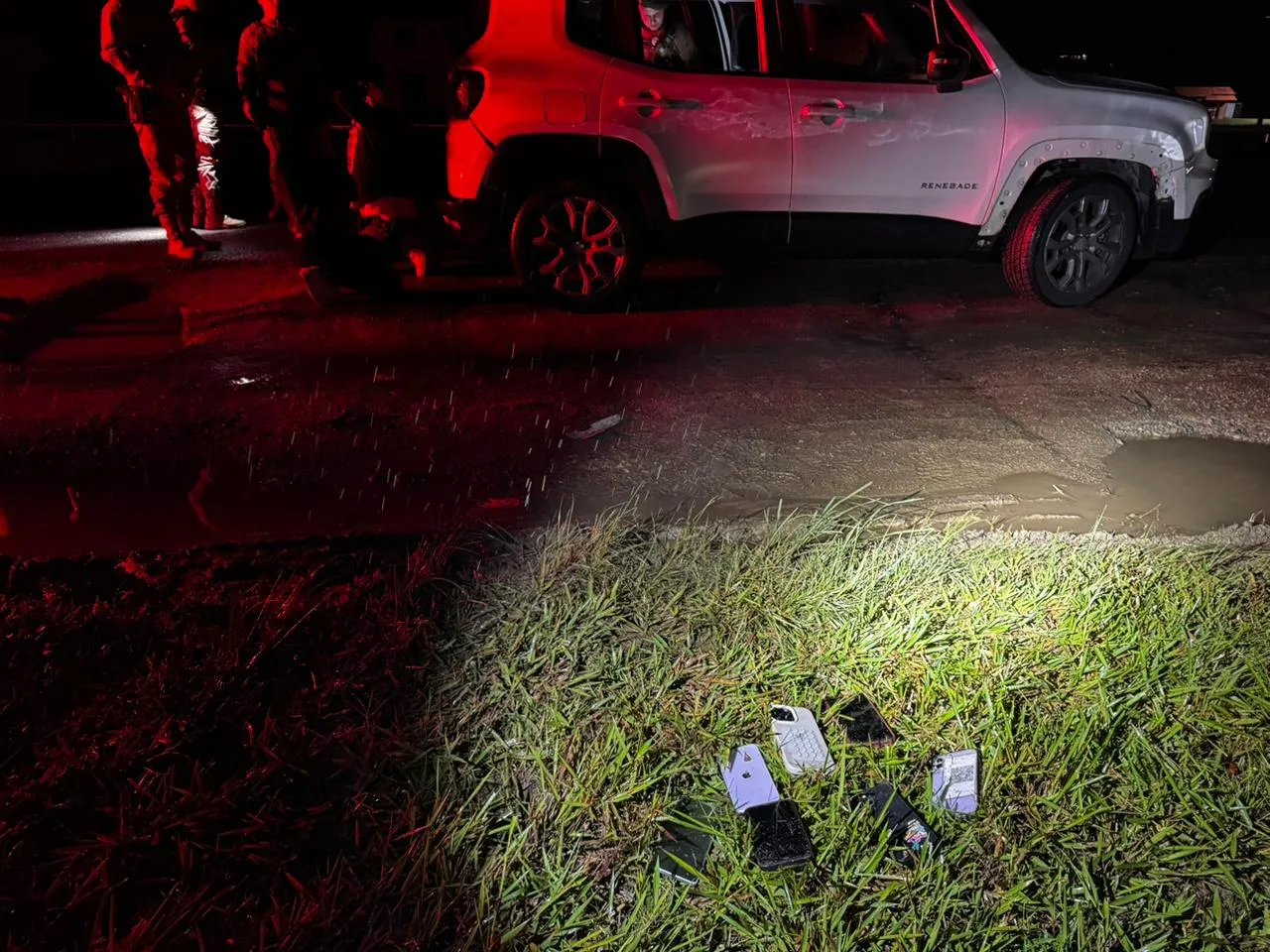 Durante a abordagem, os policiais perceberam que os ocupantes tentaram jogar objetos pela janela do carro. Logo depois, a equipe localizou e recuperou sete celulares, arremessados instantes antes da ação policial.