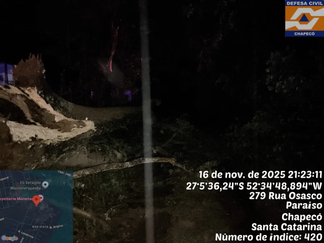 A cidade de Chapecó, no Oeste catarinense registrou estragos na noite de domingo (16), após a ocorrência de ventos moderados acompanhados de chuva intensa concentrada em um curto intervalo de tempo. A instabilidade resultou em transtornos em diferentes pontos do município e mobilizou equipes da Defesa Civil.