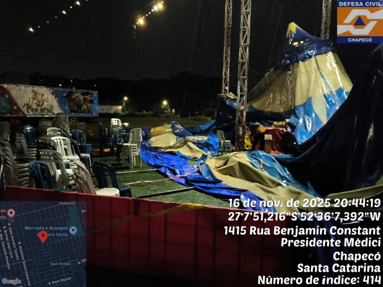 Além disso, seis pontos registraram quedas de árvores, tanto sobre residências quanto em vias públicas, o que causou bloqueios e demandou intervenções emergenciais. A queda de uma estrutura de circo montada na Rua Nereu Ramos também foi registrada. Apesar dos prejuízos materiais, ninguém ficou ferido.