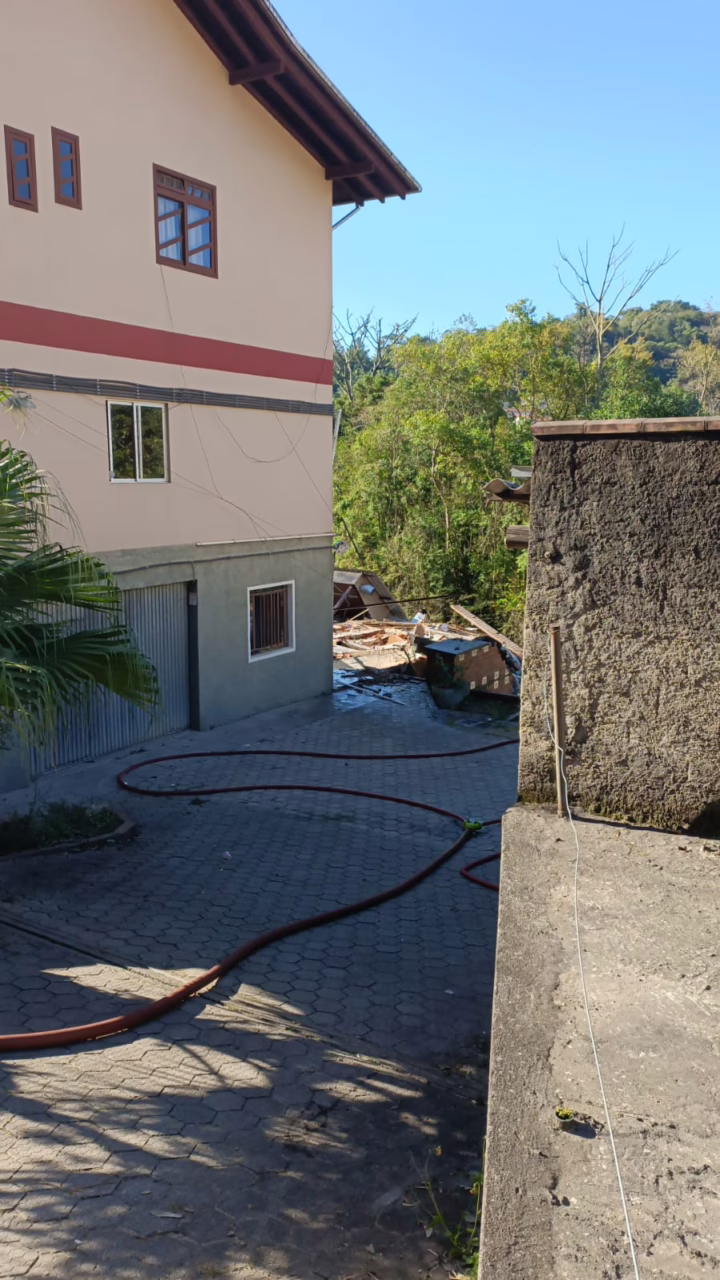 A estrutura, que abrigava quatro apartamentos, colapsou parcialmente em direção ao rio que passa nos fundos do terreno