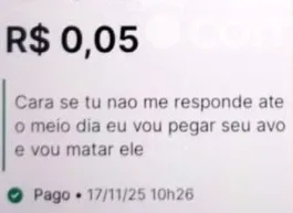 As ameaças eram feitas nas descrições das transferências de dinheiro que o suspeito fazia para o ex-companheiro. Em uma das mensagens ele diz: “Cara, se tu não me responder até o meio-dia eu vou pegar seu avô e vou matar ele”.