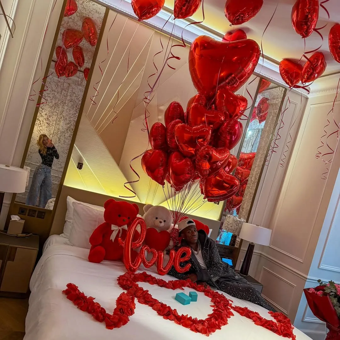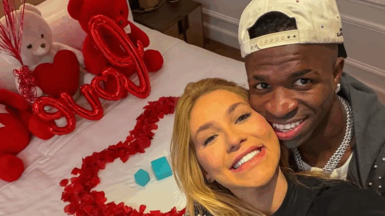 Nas fotos publicadas no Instagram, Vini e Virginia aparecem em um quarto de hotel decorado com pétalas de rosas vermelhas formando as iniciais do casal, balões com a palavra “love”, ursinhos de pelúcia e um par de alianças assinadas pela joalheria Tiffany & Co. Em uma das imagens, o craque surge deitado na cama, enquanto a influenciadora registra o momento. Em outra, Virginia aparece fazendo um coração com as mãos e exibindo o anel de compromisso.